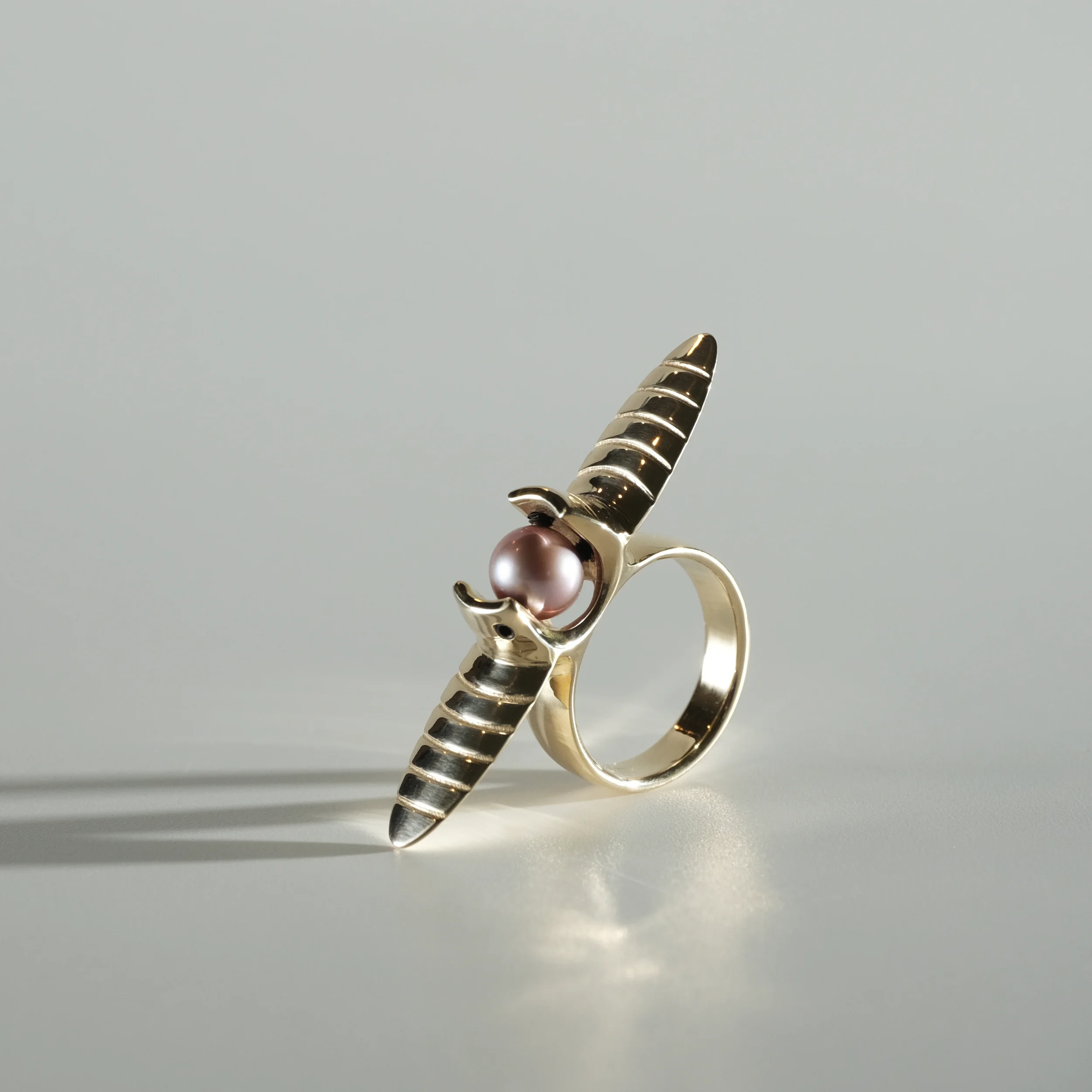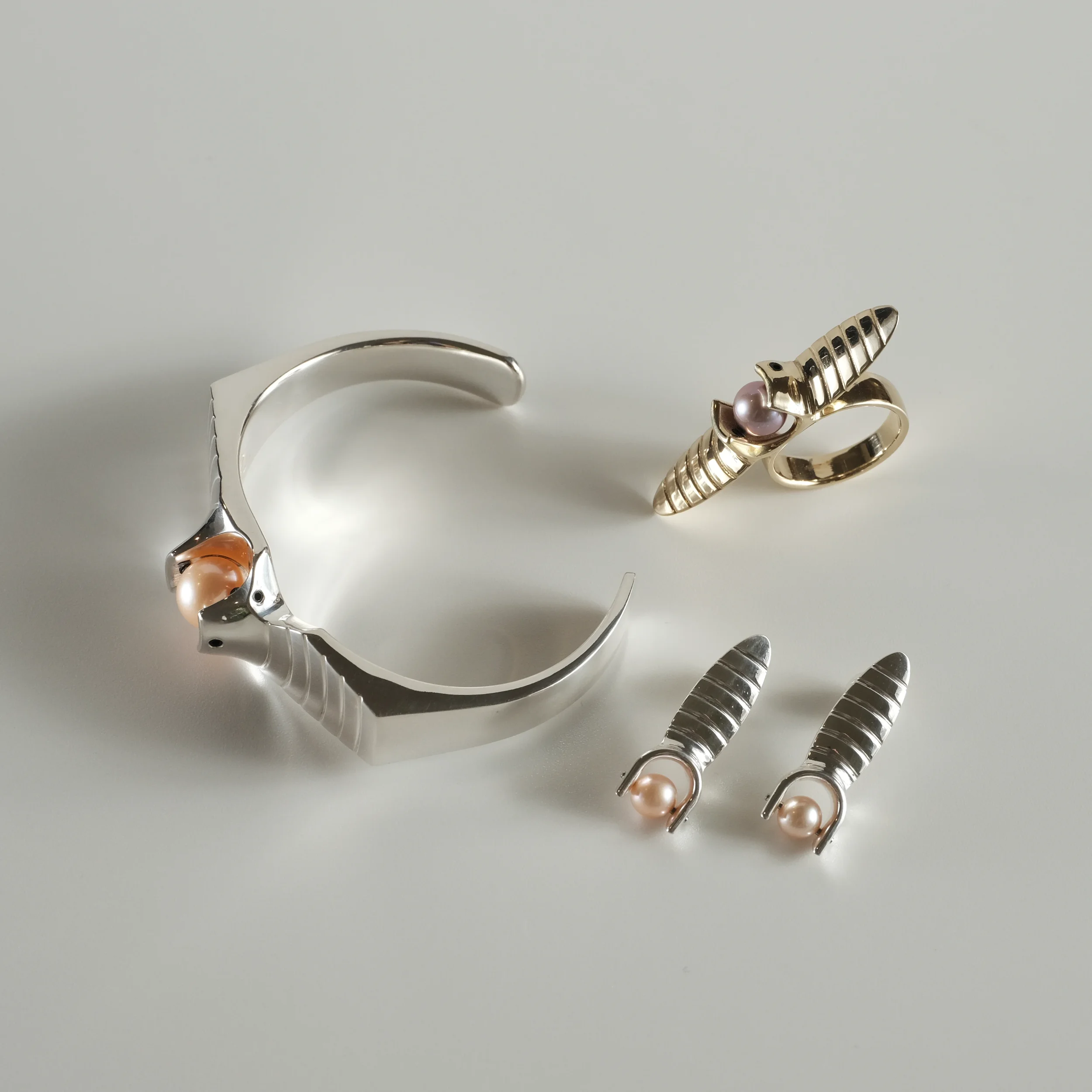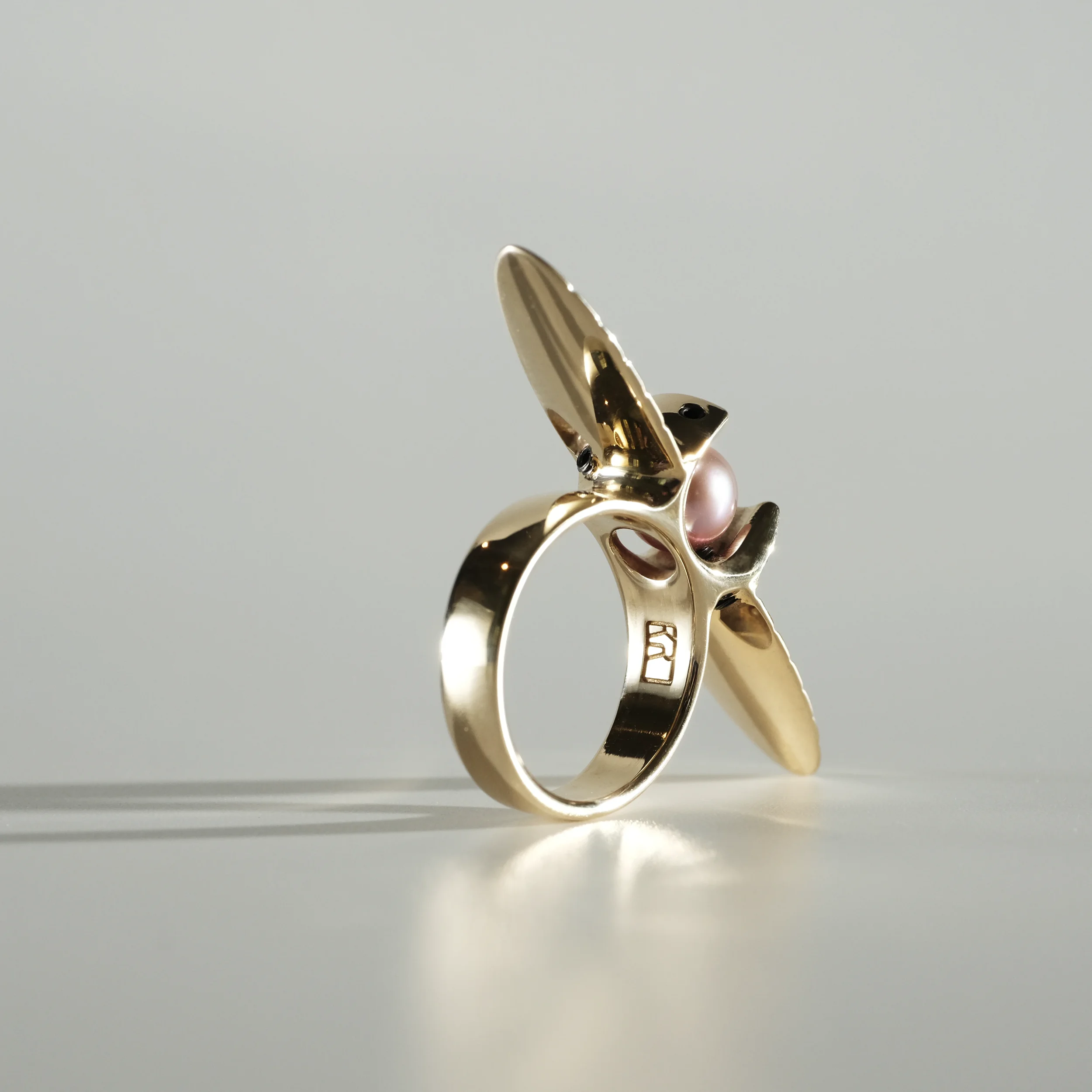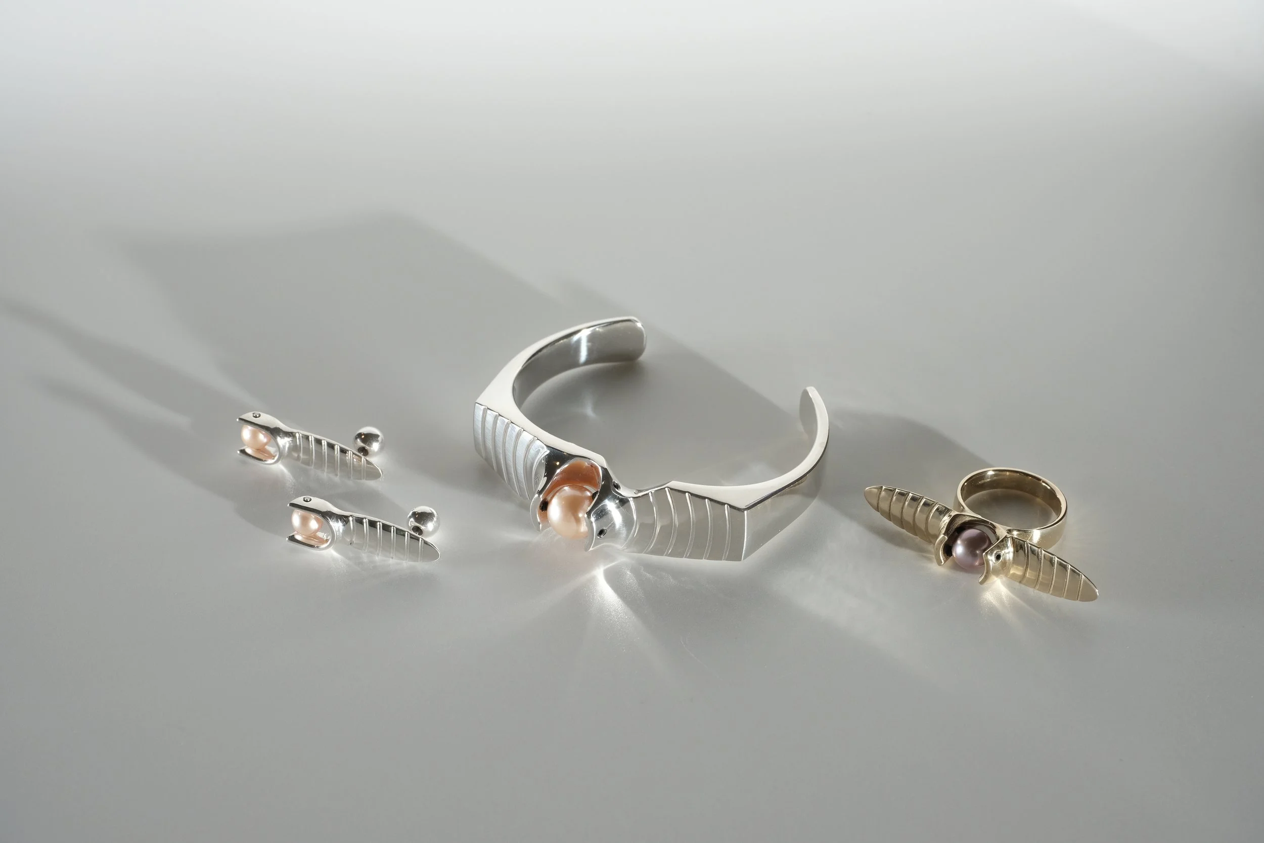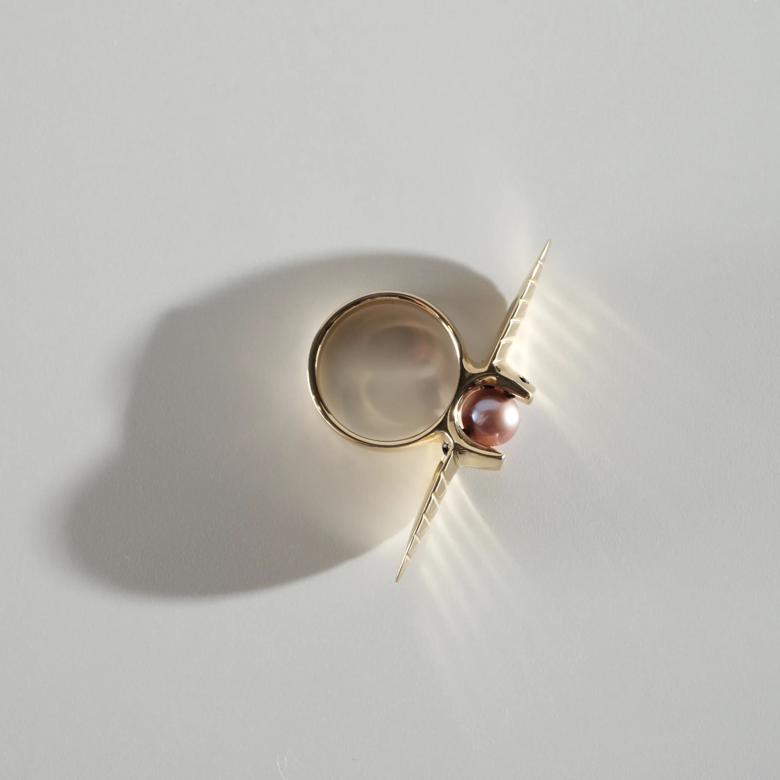 Insectile wings spread out from the center of every piece in this A pearl hovers between them, seemingly untouched by the unique 4-point setting. A throwback to some of our earliest designs, this collection is available in Argentium silver or 14k gold.