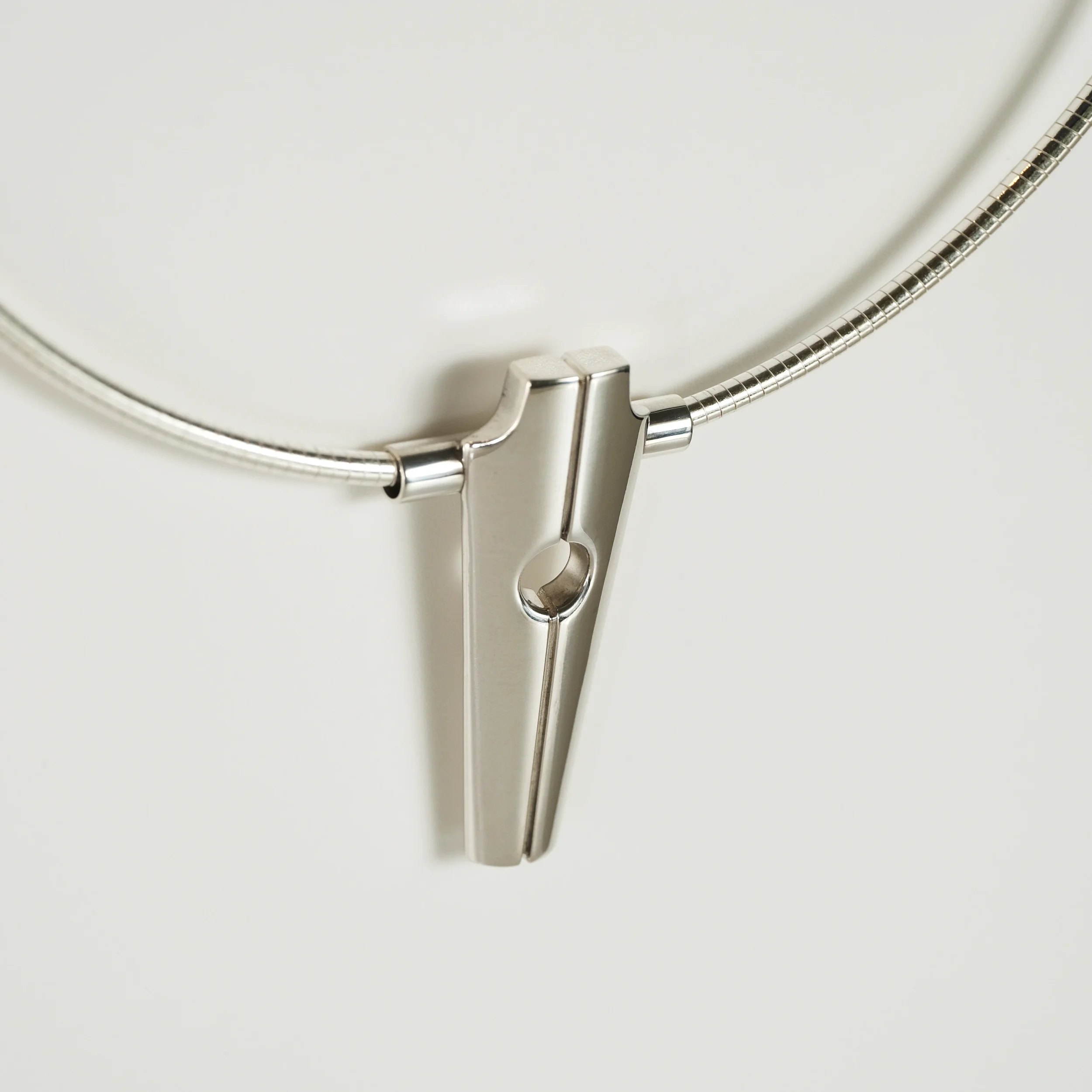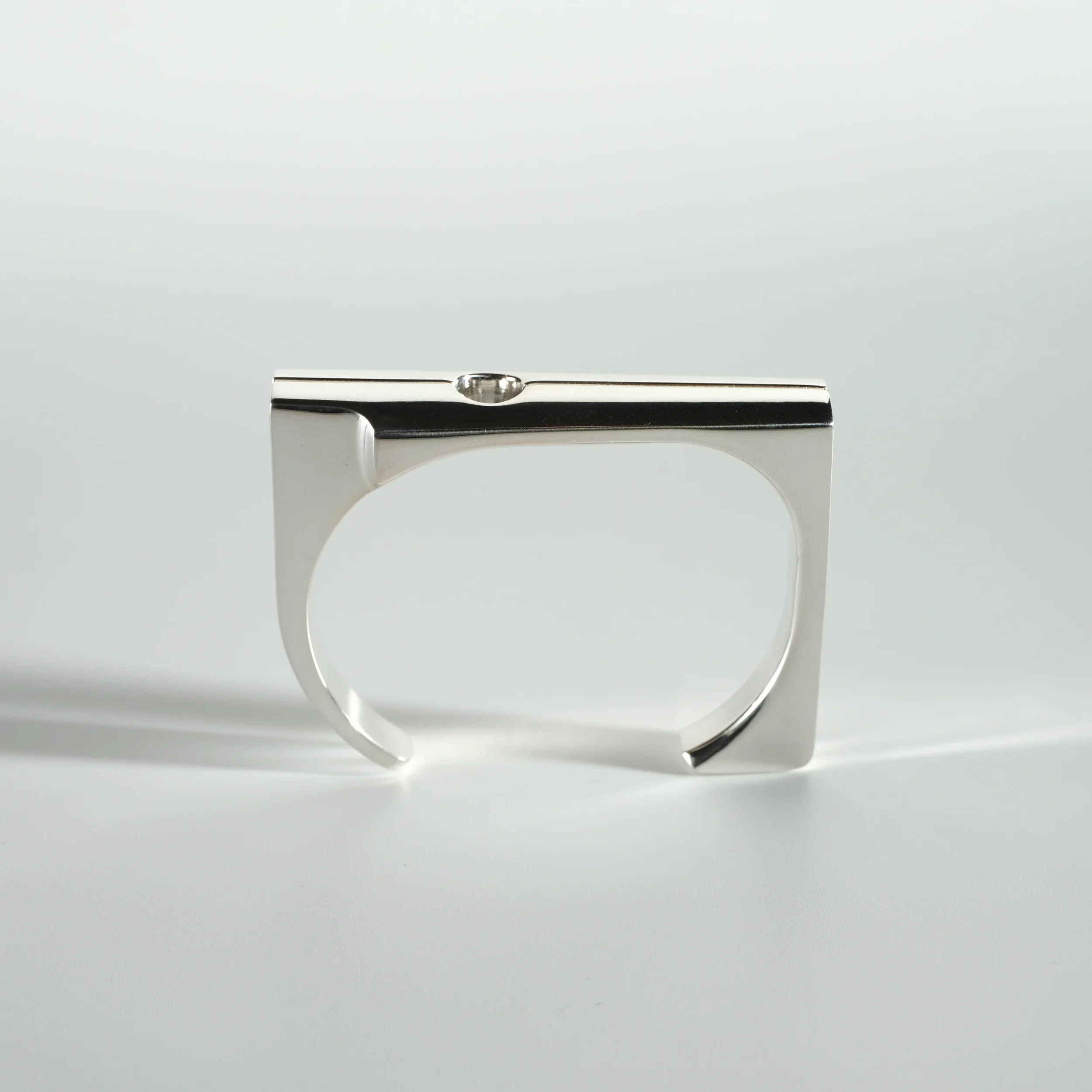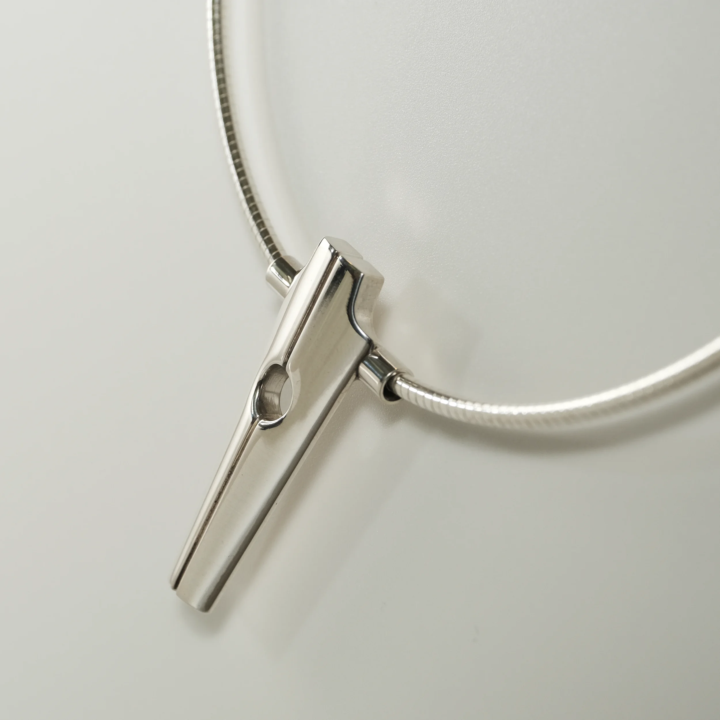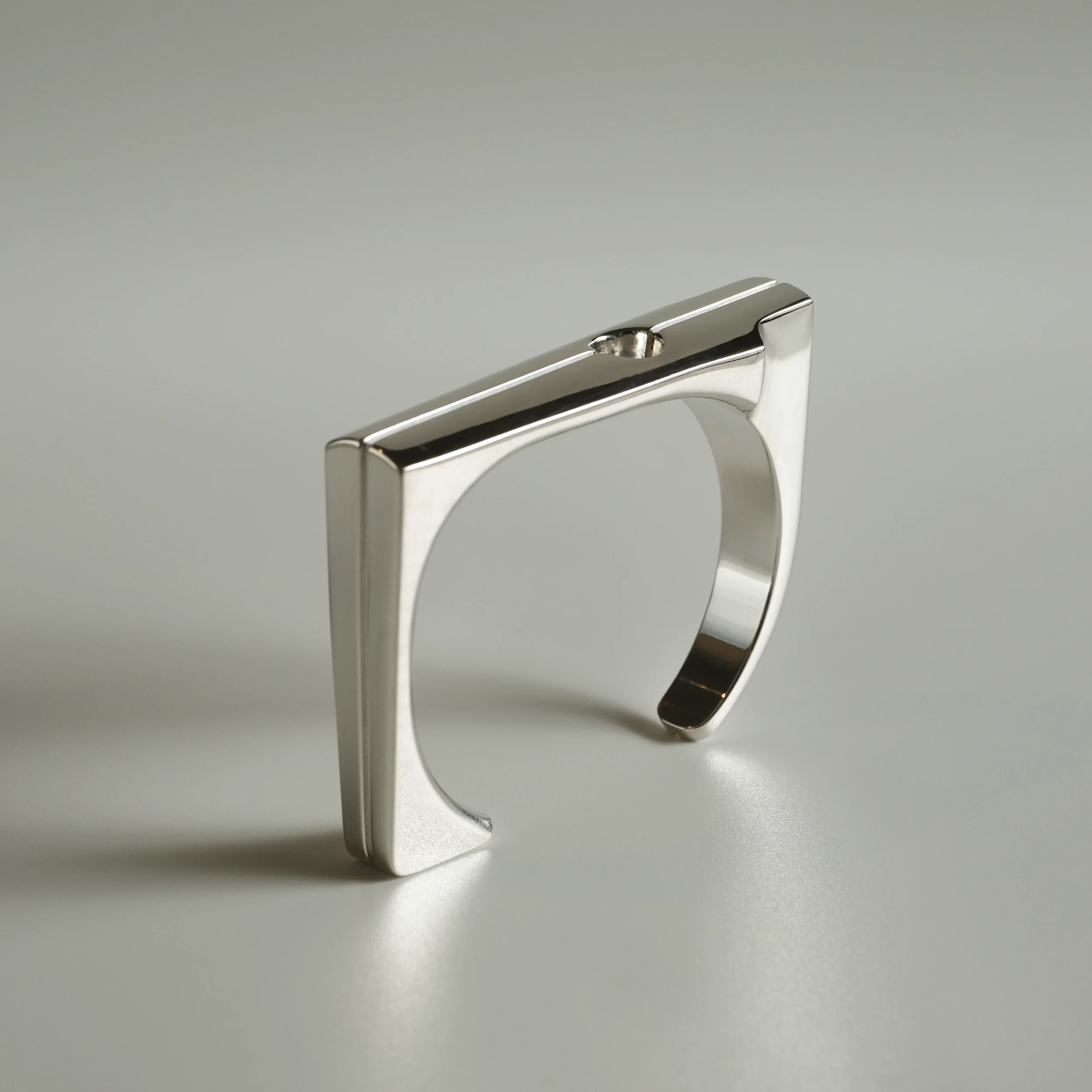 A modern take on a sacred monument. Streamlined yet substantial, with the bearing heavy enough to be the center of attention. Available in Argentium silver or 14k gold.