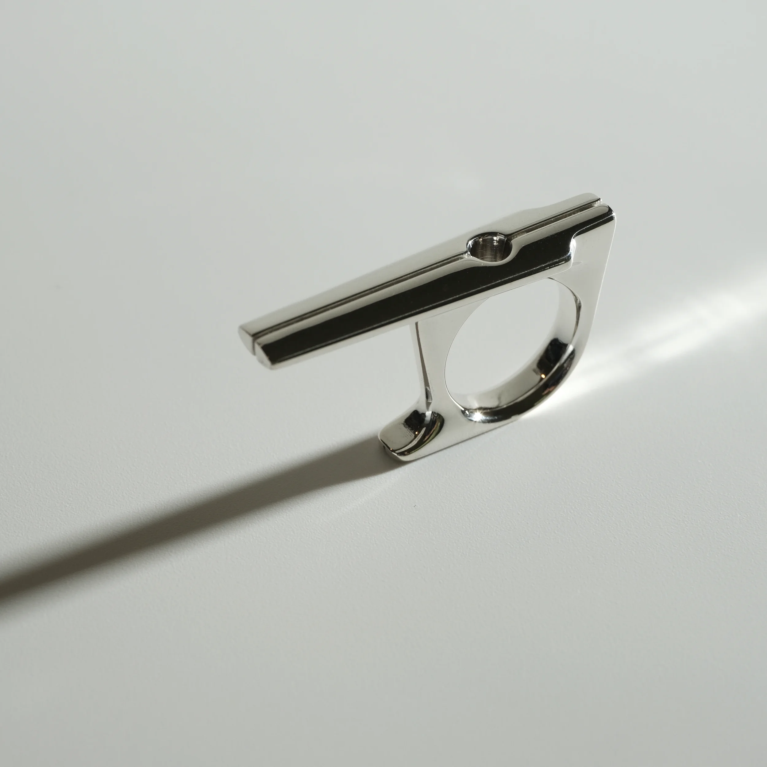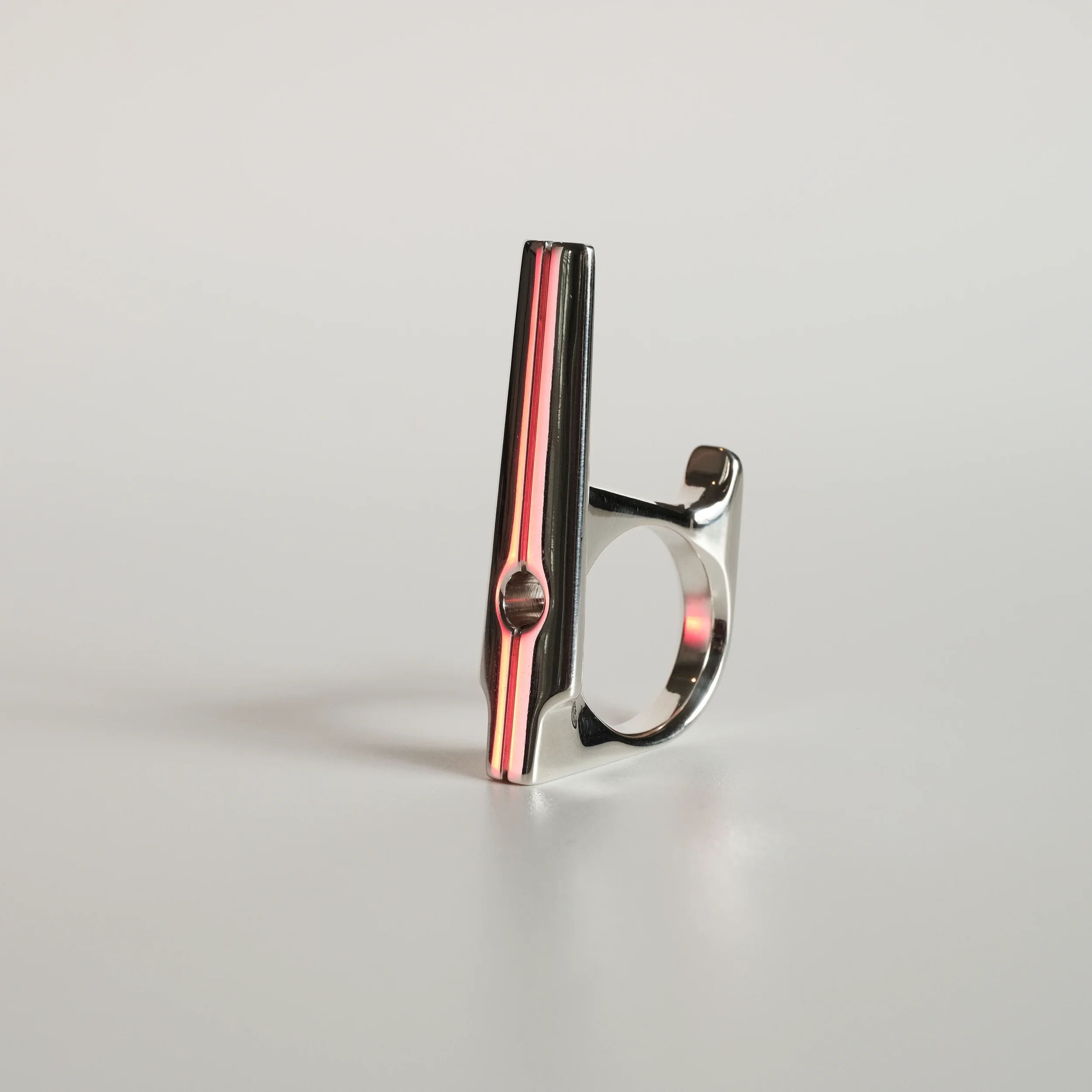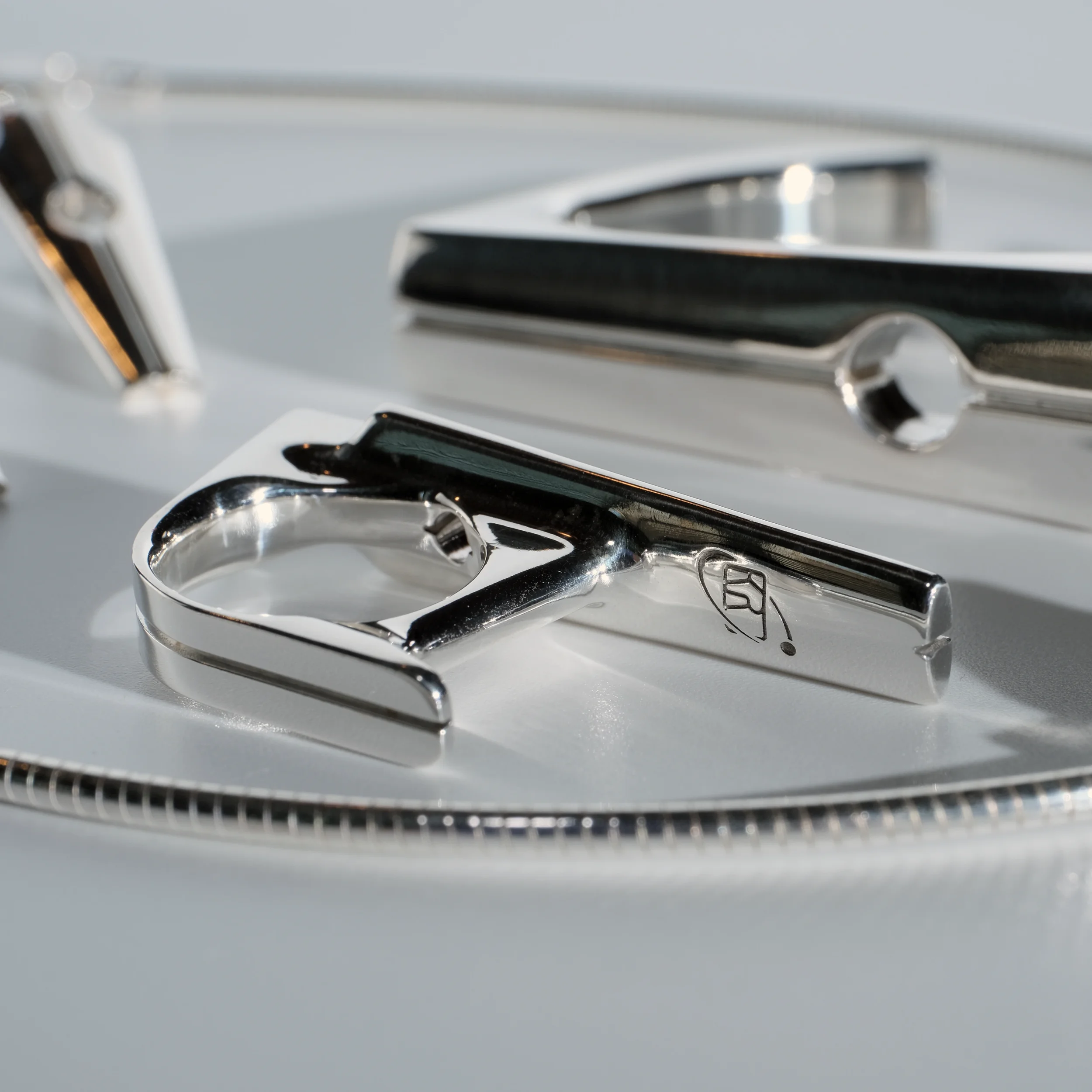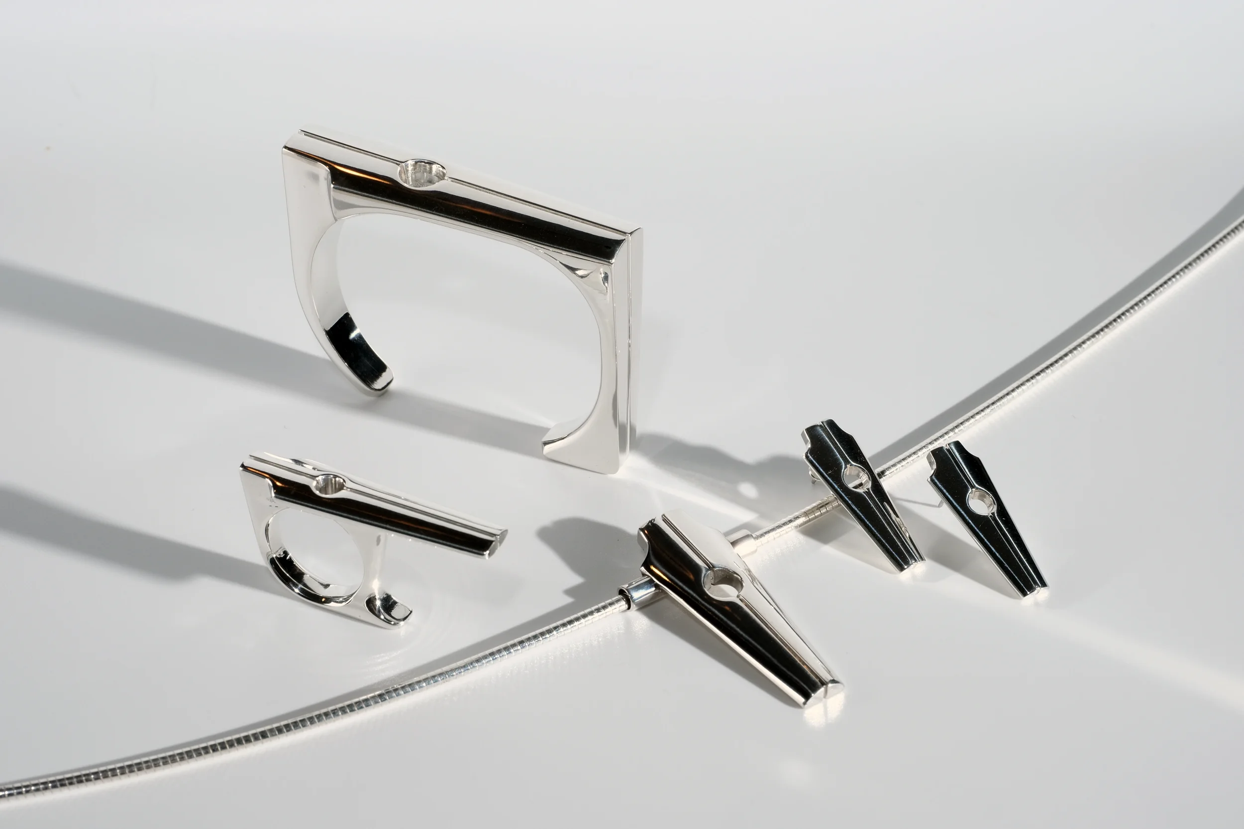 A modern take on a sacred monument. Streamlined yet substantial, with the bearing heavy enough to be the center of attention. Available in Argentium silver or 14k gold.