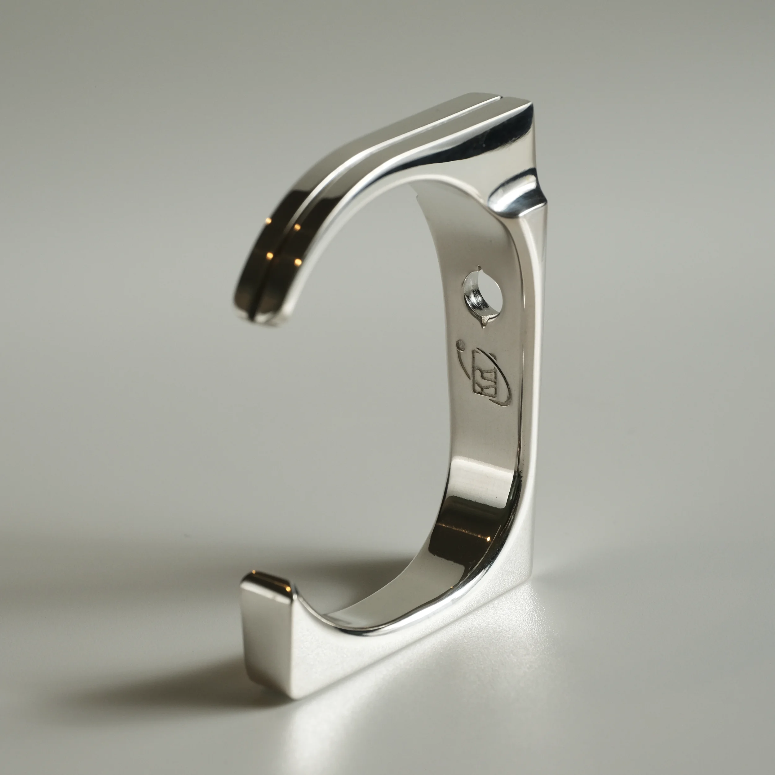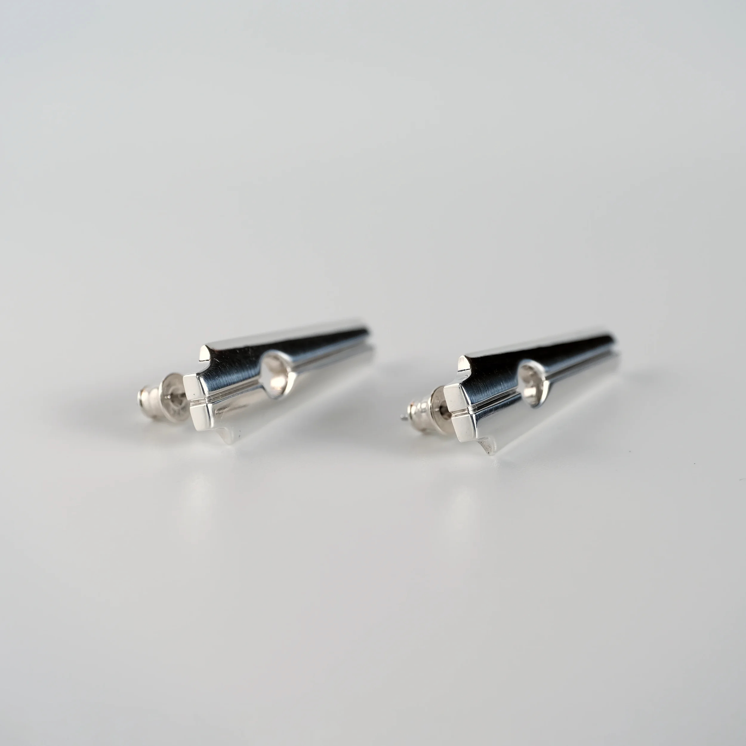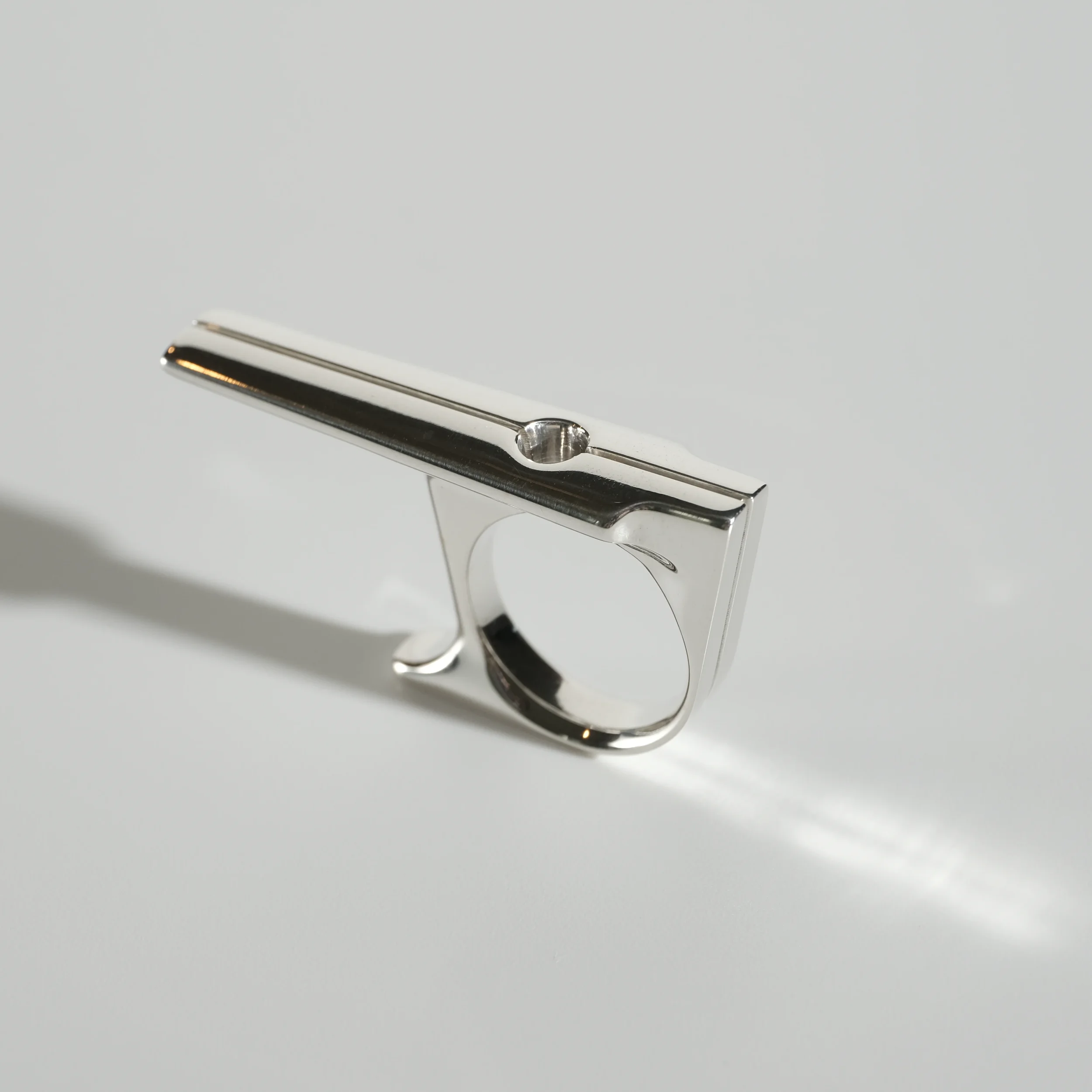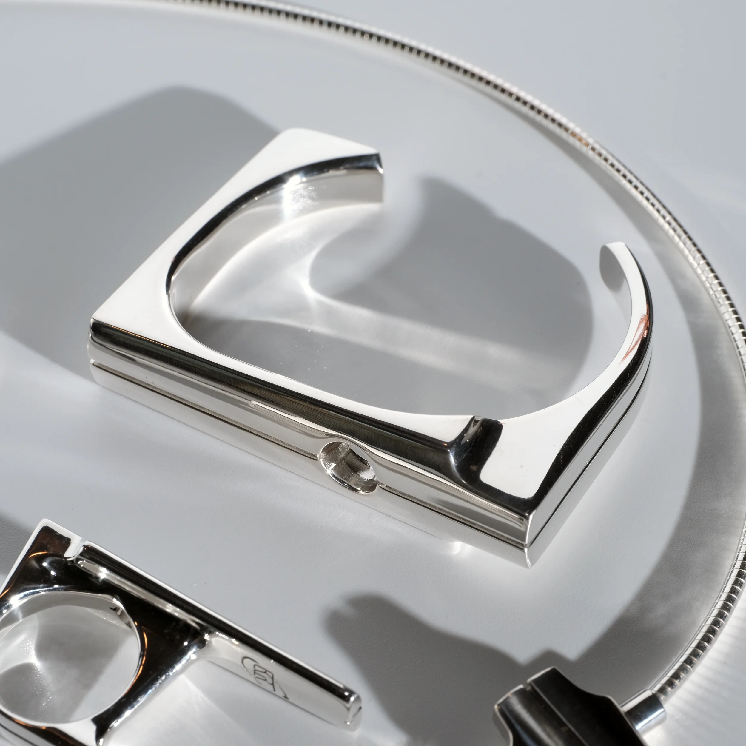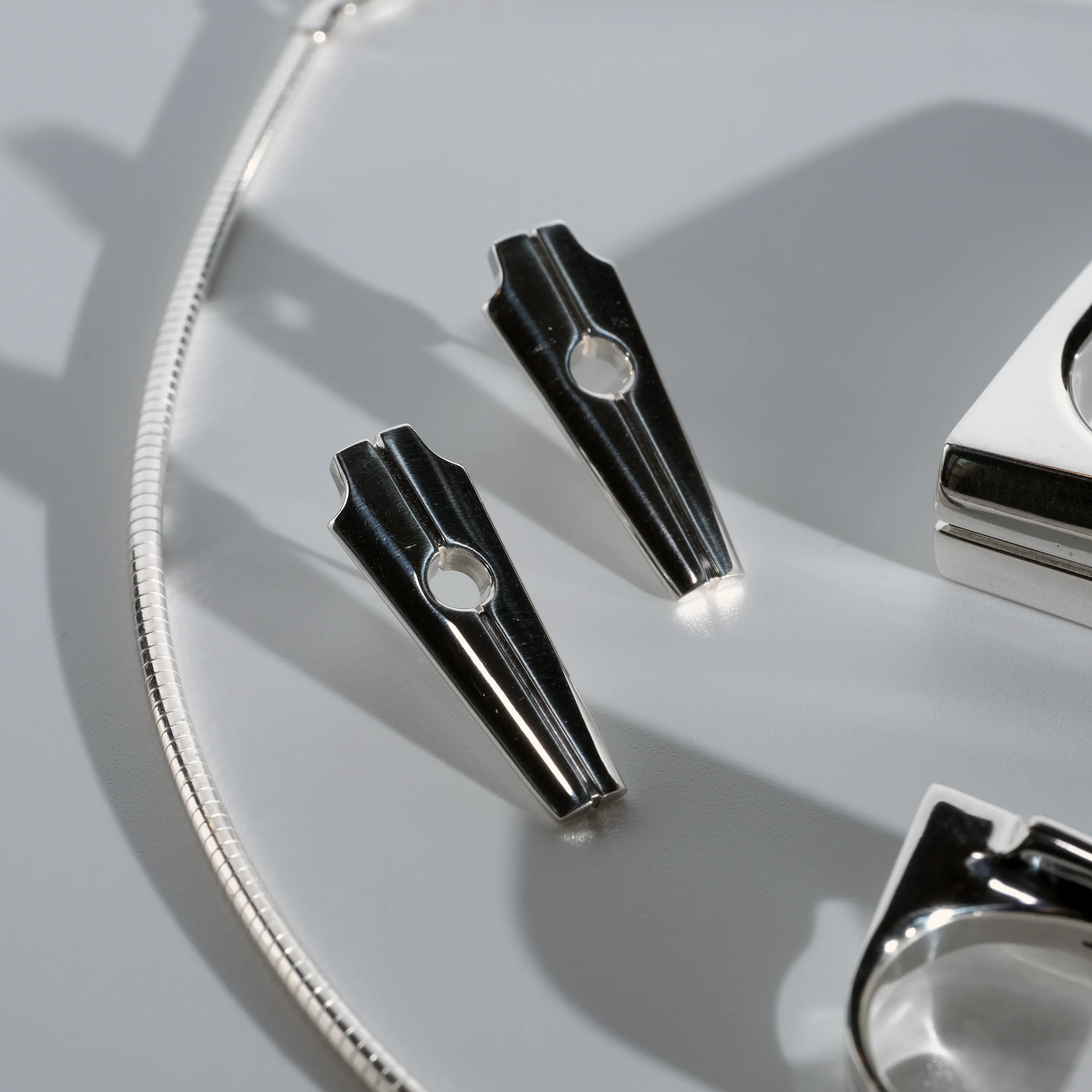 A modern take on a sacred monument. Streamlined yet substantial, with the bearing heavy enough to be the center of attention. Available in Argentium silver or 14k gold.